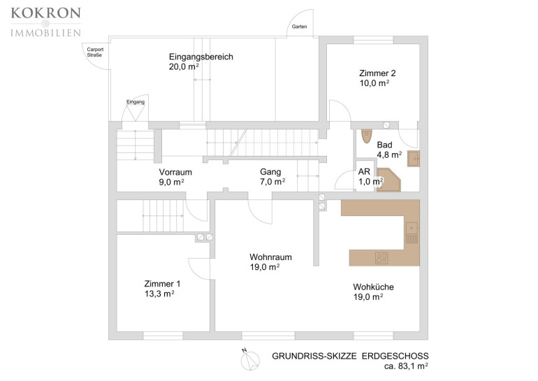 Von der Straße gelangen Sie über einen überdachten Autoabstellplatz, wo sich auch die Einfahrt in die Garage befindet, in einen lichten und überdachten Eingangsbereich vor dem Haus. Von Hier gelangen Sie in den Vorraum des Hauses, in einen Teil des Hauskellers und in den Garten.