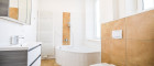 - Luxuriöses Badezimmer mit Tageslicht Genießen Sie die Eckbadewanne, das großzügige Waschbecken, die Fußbodenheizung und zwei große Fenster, die das Badezimmer in Tageslicht tauchen.