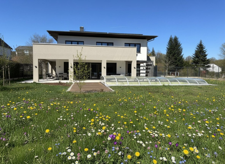 Auf diesem großzügigen Grundstück von rund 919 m² (Bauland), ergänzt durch beeindruckende 6.252 m² idyllisches Grünland, entfaltet sich ein privates Paradies, das Raum zum Durchatmen, Träumen und Gestalten bietet. Diese außergewöhnliche Villa lässt keine Wünsche offen - vom freundlichen Wohnbereich in Südwestlage mit der Möglichkeit einer Wohnraumerweiterung (z. B. durch einen Wintergarten) bis zu einem besonderen Außenbereich mit Pool - für entspannte Sonnenstunden, lange Sommerabende mit Freunden oder einfach beim Kaffee mit Blick ins Grüne.