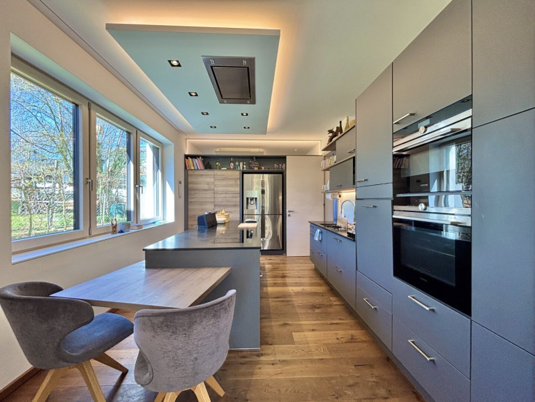 Herzstück dieser Ebene ist der weitläufige Wohn- und Essbereich mit offenem Raumkonzept, der durch seine Helligkeit und Großzügigkeit beeindruckt. Die hochwertige Küche mit angrenzender Speis erfüllt höchste Ansprüche an Design und Funktionalität. Ein zusätzliches Zimmer bietet sich ideal auch als Homeoffice an.