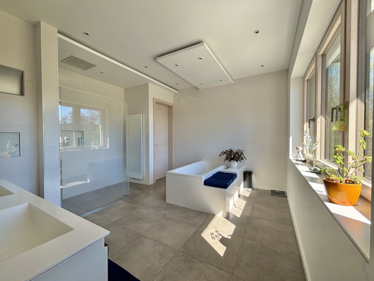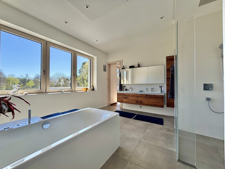 Obergeschoss (ca. 119 m²) – Rückzugsort mit Komfort und Privatsphäre: Im Obergeschoss erwartet der großzügige Masterbedroom mit direkten Zugang zum Ankleidezimmer und zu einer Terrasse mit vorbereitetem Whirlpool-Anschluss – perfekt für entspannte Stunden mit Ausblick. Das zweite Schlafzimmer eignet sich ideal als Gäste- oder Kinderzimmer. Beide Schlafzimmer sind klimatisiert und sorgen ganzjährig für ein angenehmes Raumklima. Es bestehen zusätzlich noch zwei kleinere Zimmer, diese könnten baulich auch zu einem größeren Zimmer zusammengelegt werden. Zwei stilvolle Badezimmer bieten höchsten Komfort: ein großzügiges Masterbad mit freistehender Badewanne, Dusche und separatem WC sowie ein Gästebadezimmer mit Dusche und WC. Ergänzt wird diese Ebene durch einen Hauswirtschaftsraum mit Waschmaschinenanschluss.