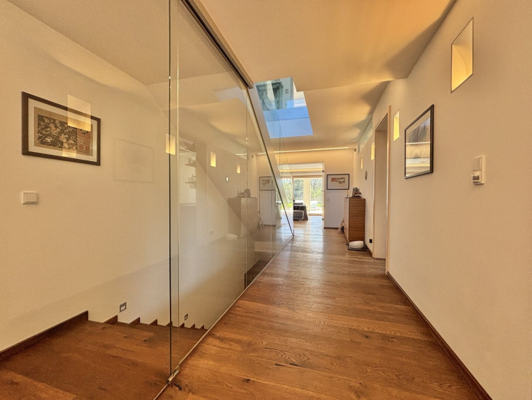 Hauptgeschoss (ca. 133 m²) – Wohnen, Leben & Genießen auf höchstem Niveau: Die Wohnebene empfängt Sie mit einem großzügigen hohen Eingangsbereich, der durch elegante Glaselemente und hochwertige Materialien sofort ein Gefühl von Exklusivität vermittelt. Edler Eichenboden (Country Vulcano der Fa. Mafi), hohe Räume, verdeckte Türenbelege sowie außenliegende Beschattung unterstreichen den modernen Wohnkomfort.
