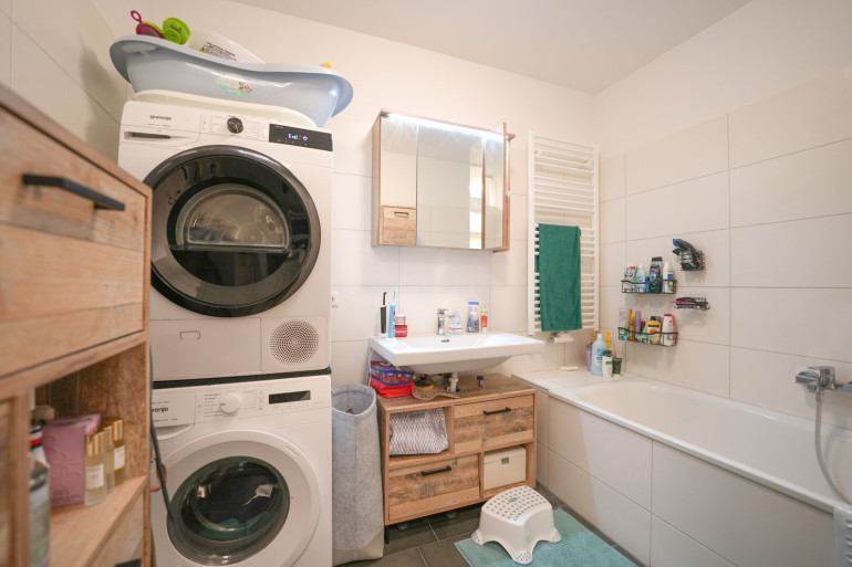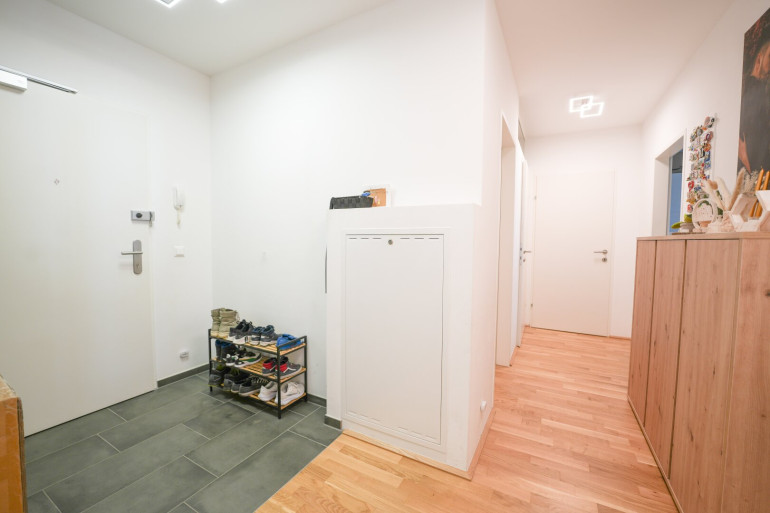 Zentraler Vorraum, großzügiges Wohnzimmer mit offener Küche und Zugang auf die Loggia, 2 Schlafzimmer, Badezimmer mit Wanne und Waschmaschinenanschluss, WC mit Handwaschbecken separat, Abstellraum, Kellerabteil und 1 Tiefgaragenstellplatz.