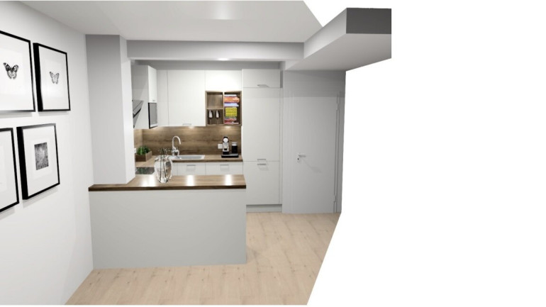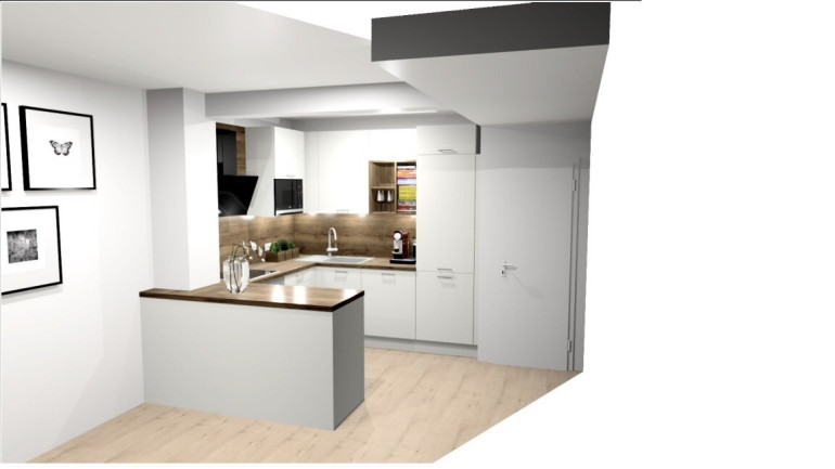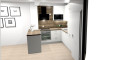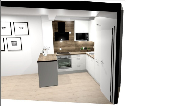 Es ist eine Einbauküche vom Tischler angefertigt mit Backrohr, Ceranfeld, Kühl- und Gefrierkombigerät, Waschbecken, Geschirrspüler und Einbaumikrowelle.