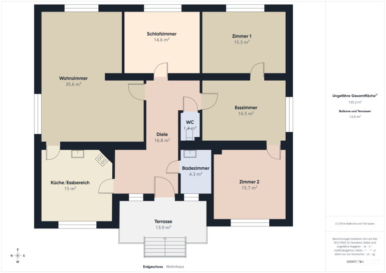 Der Bungalow bietet ca. 135 m² Wohnfläche auf einer Ebene – ideal für Familien, die komfortables Wohnen ohne klassische Stockwerke suchen.