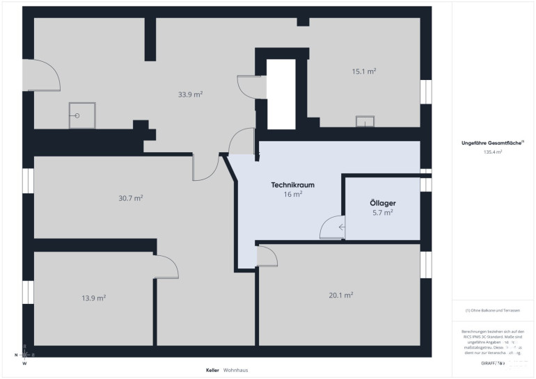 Ein großes Plus ist der voll unterkellerte Bereich (ebenfalls rund 135m²) mit mehreren Räumen, Technik- und Tankraum. Der Keller ist sowohl intern als auch direkt vom Garten aus zugänglich – ideal für Lager, Hobby oder Werkstatt.