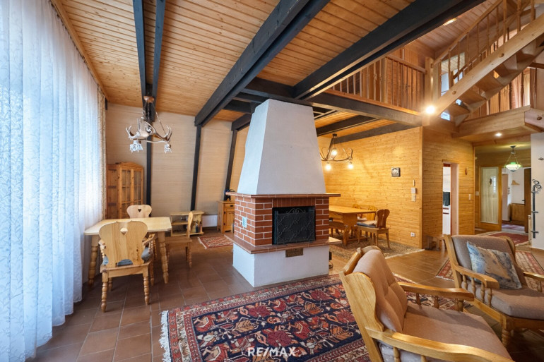 Der stilvolle Kachelofen (Baujahr 1985) sorgt nicht nur für wohlige Wärme, sondern auch für ein authentisches, alpines Ambiente.
