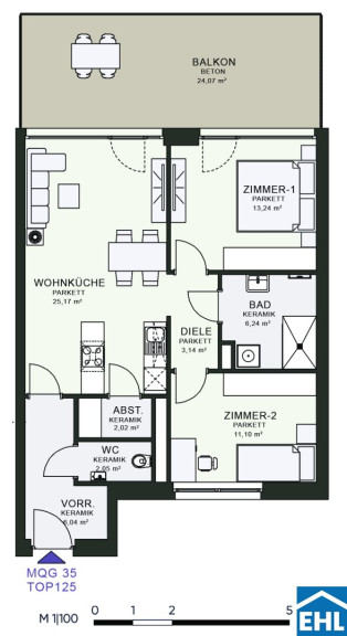 Fliesen, Parkett, Fußbodenheizung, Wohnküche / offene Küche, Personenaufzug, Dusche