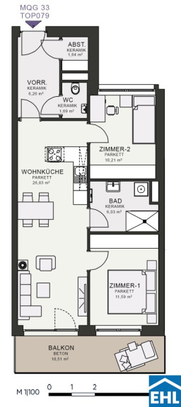 Fliesen, Parkett, Fußbodenheizung, Wohnküche / offene Küche, Personenaufzug, Dusche