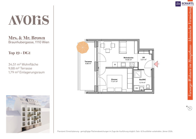 Wohnfläche: ca. 34,51m² + Balkon: ca. 9,88m² + Kellerabteil: ca. 1,79m²