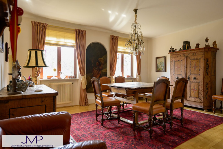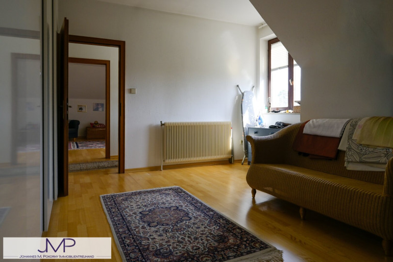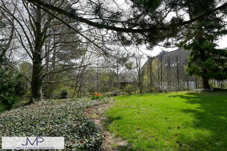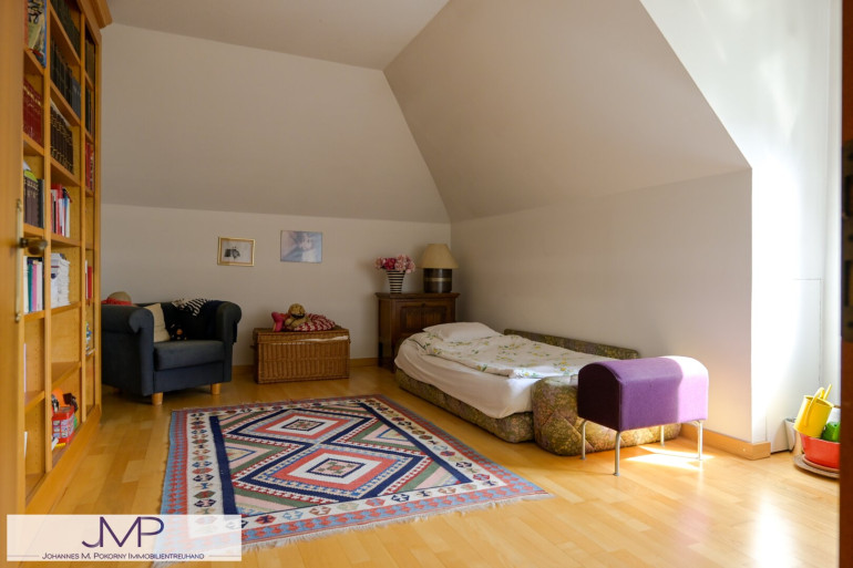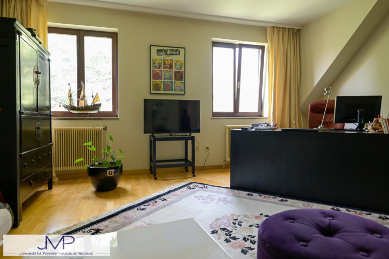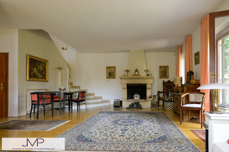 Das Erdgeschoss überzeugt dabei mit einem großzügigen Wohnzimmer, das durch einen offenen Kamin im französischen Stil eine besonders angenehme Wohnatmosphäre schafft. Von hier aus gelangt man direkt in den weitläufigen, nordostseitig ausgerichteten Garten. Ein separates Esszimmer mit Morgensonne, eine getrennte Küche sowie ein praktisches Gästezimmer mit eigenem Duschbad runden diese Ebene ab.