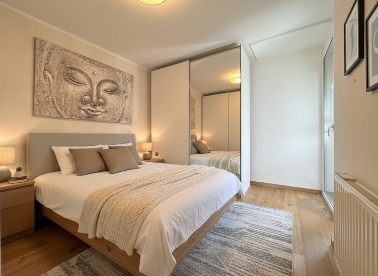 Das Herzstück bildet der offene Wohn- und Essbereich mit moderner Küche samt Kochinsel. Von hier aus sowie von beiden Schlafzimmern besteht direkter Zugang auf die rund 22,68 m² große Terrasse und in den ca. 69,43 m² umfassenden, uneinsehbaren Garten. Die Südwest-Ausrichtung sorgt für lange Sonnenstunden und ein besonders angenehmes Wohnklima. Der großzügige Außenbereich bietet ein hohes Maß an Privatsphäre – ein echtes Highlight für alle, die Ruhe und Freiraum schätzen.