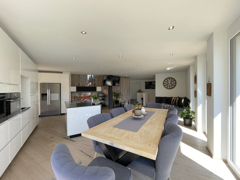Der moderne Zubau setzt dazu einen spannenden architektonischen Kontrast: klare Linien, raumhohe Verglasungen und ein offener Wohnbereich mit Designküche sorgen für ein lichtdurchflutetes, zeitgemäßes Ambiente. Ergänzt wird dies durch private Gartenflächen und eine durchdachte Raumaufteilung.