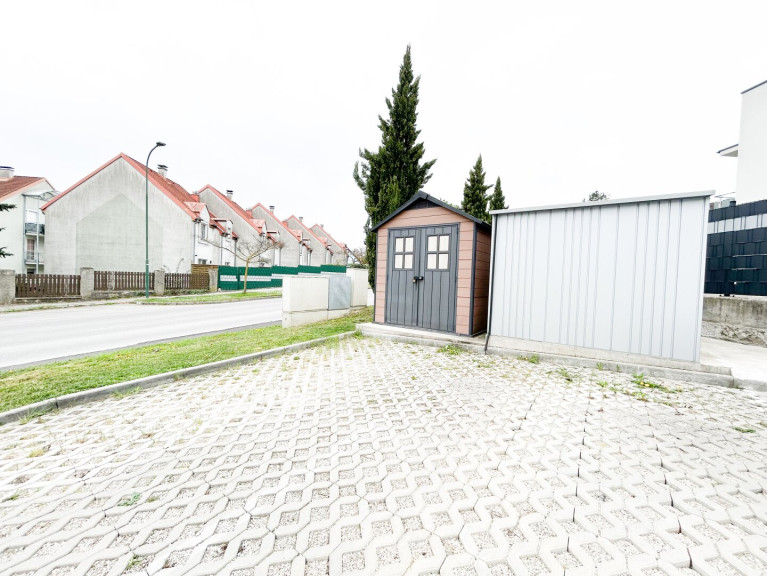 Zusätzlichen Stauraum bietet eine praktische Holzhütte im Außenbereich. Abgerundet wird dieses attraktive Angebot durch zwei im Kaufpreis inkludierte Stellplätze.