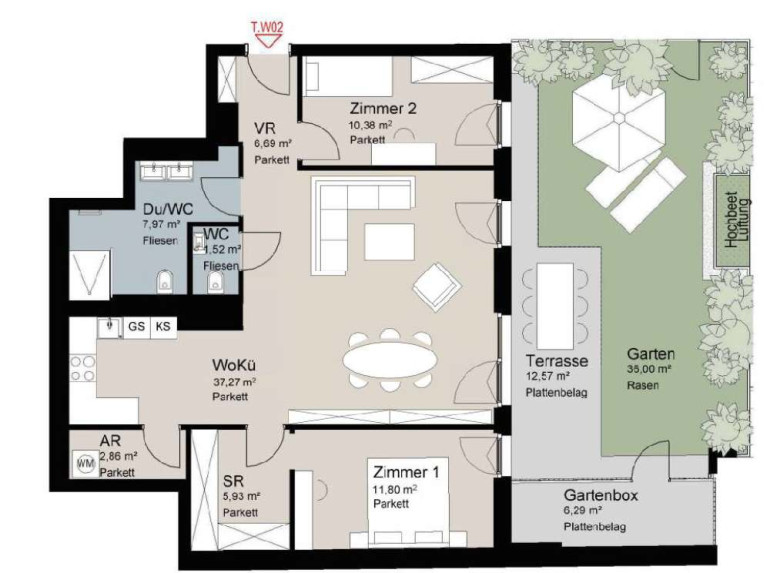 ObjektbeschreibungDiese westseitig orientierte 3-Zimmer-Gartenwohnung verfügt über einen direkten Gartenzugang von jedem Zimmer aus. Sie eignet sich ideal für Familien mit kleinen Kindern oder für Paare, die separate Räume für Homeoffice benötigen.