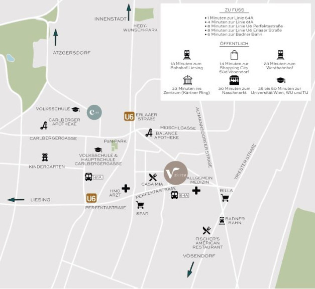 Der 23. Bezirk besteht zu rund 30 % aus Grünflächen. Die unmittelbare Umgebung von Vincent überzeugt mit zahlreichen Naherholungsgebieten wie dem Schlosspark Alterlaa, der Perchtoldsdorfer Heide, dem Draschepark, dem Wienerwald sowie landwirtschaftlichen Nutzflächen, Gärtnereien und weitläufigen Wiesen.