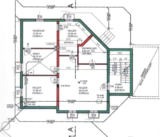 Das moderne zweistöckige Gebäude mit Keller wurde im ca. Jahre 2002 errichtet und gliedert sich laut Einreichplänen in: