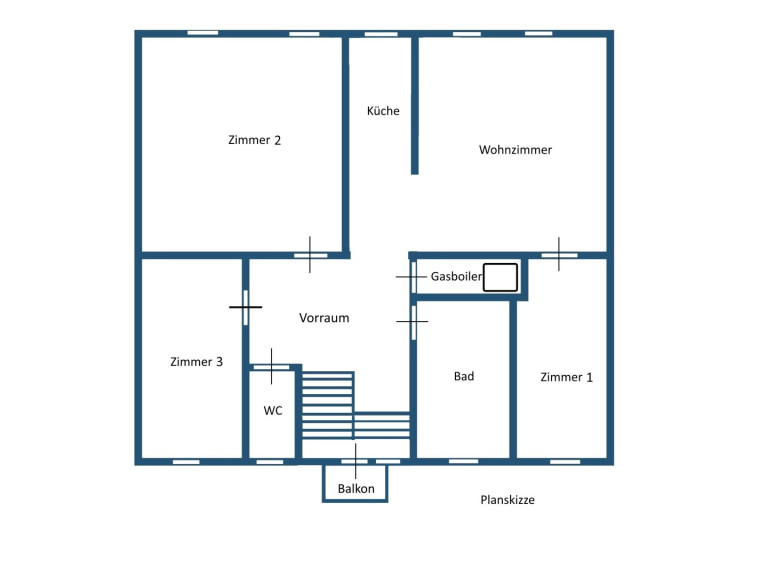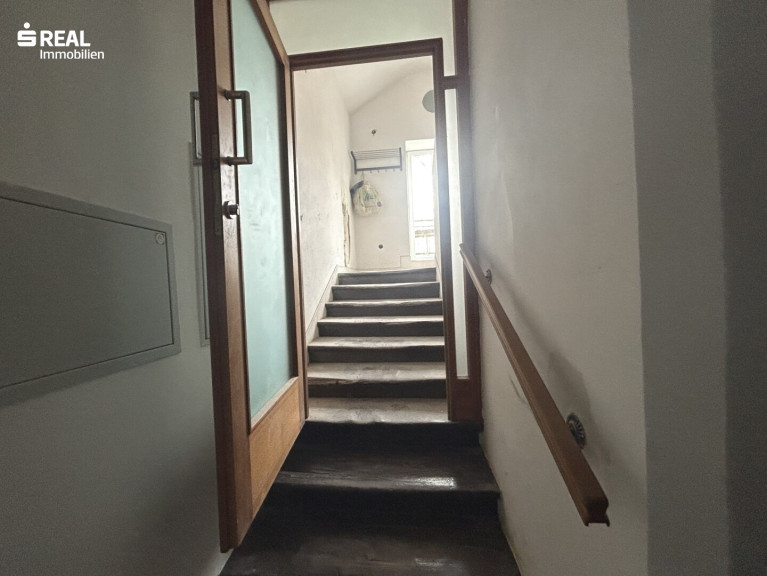 Stiegenaufgang mit kleinem Balkon, offen gestalteter Vorraum, Bad, Abstellraum mit Gastherme, Küchenbereich mit angeschlossenem großem Wohnzimmer, 3 weitere Zimmer (davon 1 großes Masterbedroom), WC