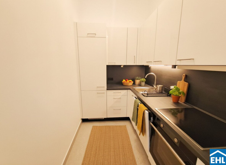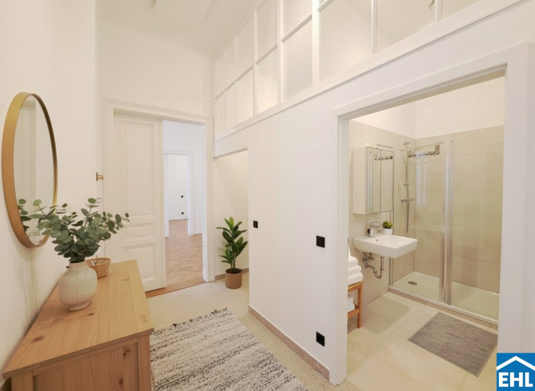Ergänzt wird dieses Flair durch geschmackvolle, zeitgemäße Komponenten wie großformatige, moderne Fliesen, ein neu gestaltetes Badezimmer mit großzügiger Dusche sowie eine neue, funktional ausgestattete Küche, die vom Wohnraum getrennt ist. Im Eingangsbereich sorgen Einbauschränke für optimal genutzten Stauraum.
