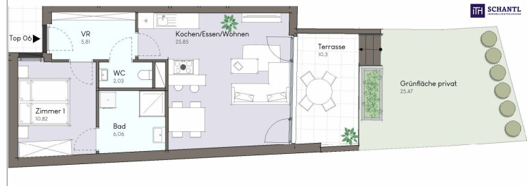 Wohnfläche: ca. 50,57 m² + Terrasse: ca. 10,30 m² + Garten: ca. 25,47 m² + Kellerabteil