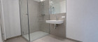 - stilvolles Badezimmer mit bodenebener Dusche, Waschtisch und viel Raum für Ordnung