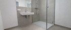 - stilvolles Badezimmer mit bodenebener Dusche, Waschtisch und viel Raum für Ordnung