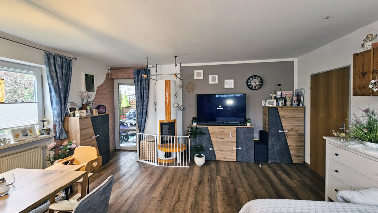 Die helle Wohnung mit durchdachter Raumeinteilung ist teilweise mit schönen Echtholzböden ausgestattet, die Beheizung erfolgt mit Radiatoren und einem Speicherkachelofen im Wohnzimmer.