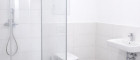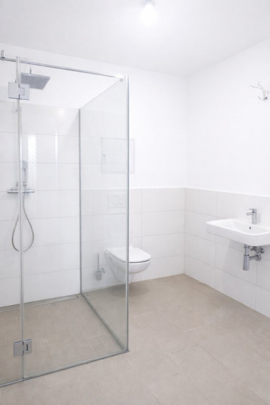 - Badezimmer mit verglaster Dusche und WC
