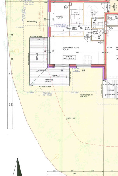 Die Wohnung verfügt über eine Wohnfläche von ca. 60,02m², zusätzlich ca. 178,41m² Gartenfläche und einer Terrasse mit 24,26m².