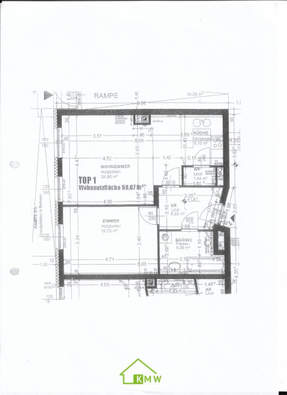 Die Wohnfläche von knapp 60m² verteilt sich auf Vorraum, Bad mit WC, Schlafzimmer, Wohnzimmer mit Essbereich und moderner Küche sowie einen Abstellraum.