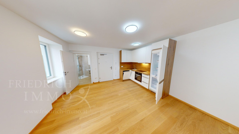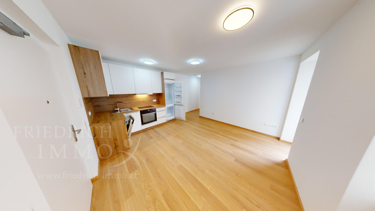 Die attraktive Wohnung wird direkt über die offene Wohnküche betreten, die als Mittelpunkt des täglichen Lebens dient. Die Markenküche inklusive Geräten ist modern ausgestattet und bietet genügend Platz für kulinarische Entfaltung. Große Fenster mit Dreifachverglasung sorgen für angenehme Lichtdurchflutung und eine offene, einladende Atmosphäre. Geölter Eichenparkett und hochwertiges Feinsteinzeug in den Nassräumen unterstreichen den gehobenen Ausstattungsstandard.