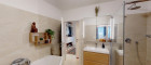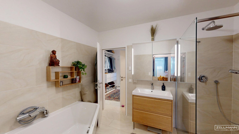 Das Badezimmer präsentiert sich zeitlos und hochwertig mit Dusche und Badewanne. Helle Materialien und eine klare Linienführung sorgen für eine angenehme, ruhige Atmosphäre.