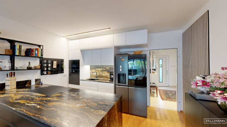 Die höchst moderne Küche fügt sich elegant in den Wohnbereich ein und überzeugt durch ihre klare Gestaltung und hochwertige Ausführung. Sie wird zum zentralen Treffpunkt des Alltags und verbindet Funktionalität mit stilvollem Design.