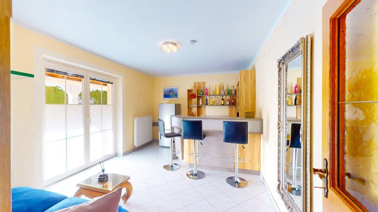 Ein weiteres Highlight im Erdgeschoss ist der Partyraum mit ca. 16,8 m². Dieser Bereich ist mit hellem Fliesenboden ausgestattet und verfügt über eine Theke sowie einen direkten Zugang zur überdachten Terrasse mit ca. 19,8 m². Damit entsteht ein idealer Raum für gesellige Abende, Familienfeiern, Geburtstage oder einfach für entspannte Stunden mit Freunden. Der Übergang zwischen Innen- und Außenbereich ist hier besonders gelungen und schafft eine einladende Atmosphäre für gemeinsame Momente.