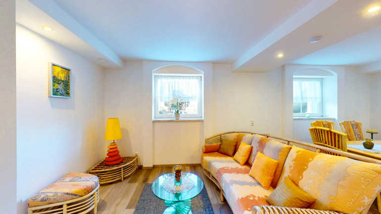Über das Treppenhaus gelangen Sie in das Untergeschoss, das aktuell als Gästewohnung genutzt wird und sich hervorragend als separater Wohnbereich, Mehrgenerationenlösung oder Rückzugsbereich für Besucher eignet. Der großzügige Wohn-/Essbereich mit ca. 25,4 m² vermittelt sofort ein Gefühl von Offenheit und Komfort. In Kombination mit dem Holzfußboden, den weißen Wänden und den Vollholztüren entsteht ein stimmiges, gepflegtes Gesamtbild mit natürlicher Wohnlichkeit.