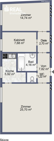 Die Altbauwohnung verfügt über ein großzügiges Wohnzimmer mit angrenzender Küche, ein separates Schlafzimmer sowie ein zusätzliches Kabinett, das sich ideal als Arbeits- oder Gästezimmer eignet. Das Badezimmer ist mit einer Badewanne ausgestattet, das WC ist getrennt begehbar.