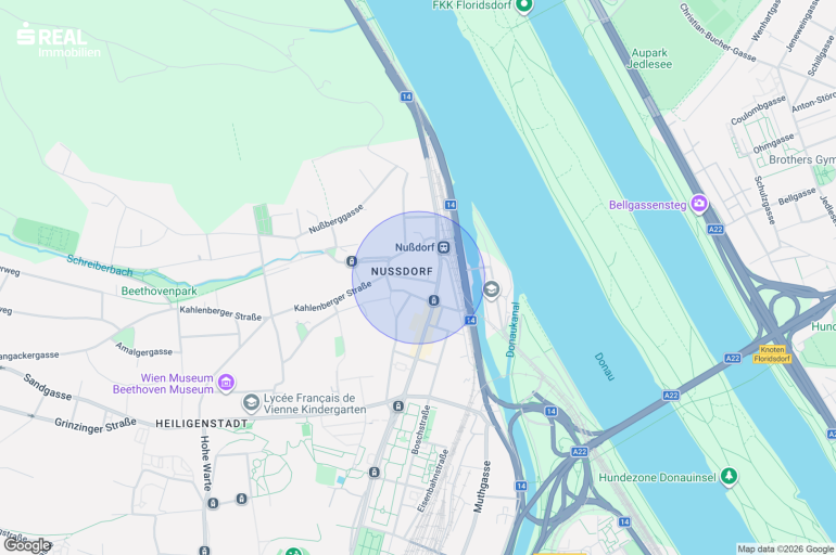 Die Lage nahe dem Donaukanal zählt zu den besonders gefragten Wohngegenden Wiens und bietet eine hervorragende Infrastruktur. Öffentliche Verkehrsmittel befinden sich in unmittelbarer Nähe: Die Straßenbahnlinie D ermöglicht eine direkte Verbindung in die Wiener Innenstadt. Darüber hinaus sind die U-Bahnlinie U4 sowie die S-Bahn-Station Heiligenstadt bequem fußläufig erreichbar.