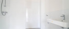 - Badezimmer mit Dusche, Waschbecken, Waschmaschinenanschluss und Toilette