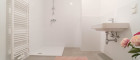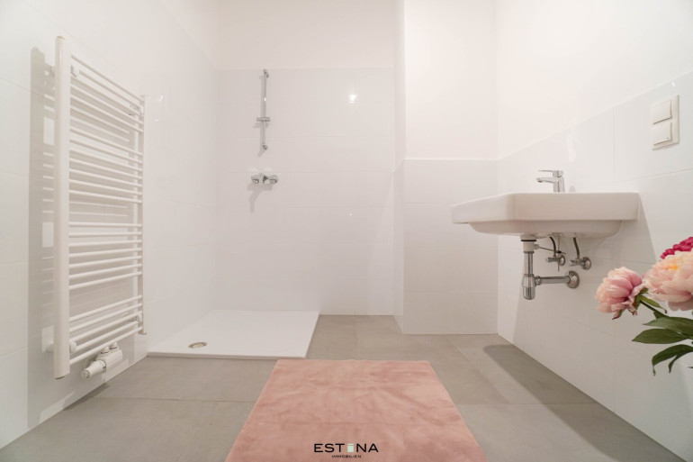- Badezimmer mit Dusche, Waschbecken und Waschmaschinenanschluss