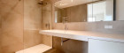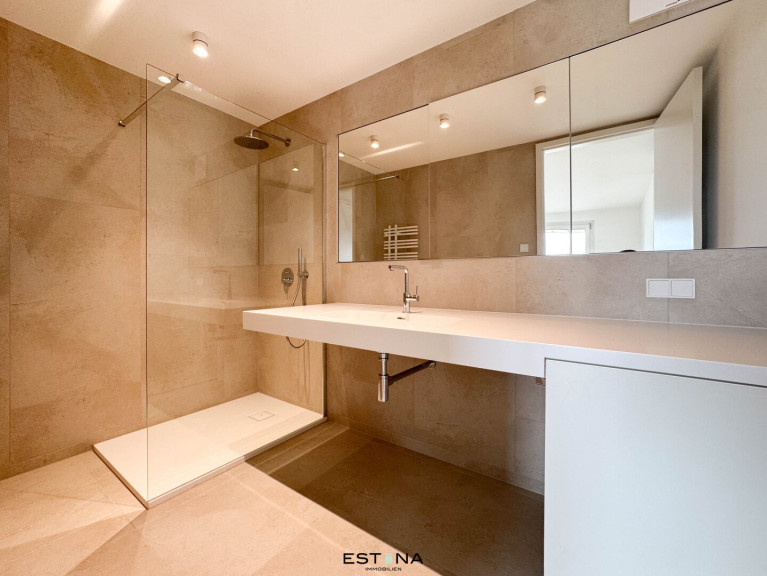 - Badezimmer mit Walk-In Dusche, Doppelwaschbecken und Waschmaschinenanschluss