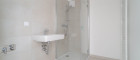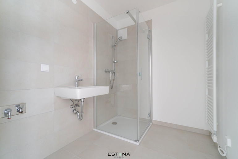 - Badezimmer mit Dusche, Waschbecken und Waschmaschinenanschluss