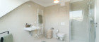 - Badezimmer mit Dusche, Waschbecken, Waschmaschinenanschluss und Toilette