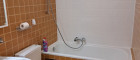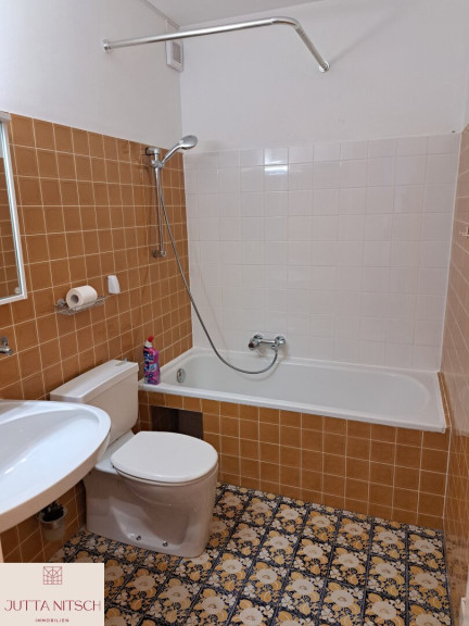 - Badezimmer mit Waschtisch, Badewanne, WC und Waschmaschinenanschluss