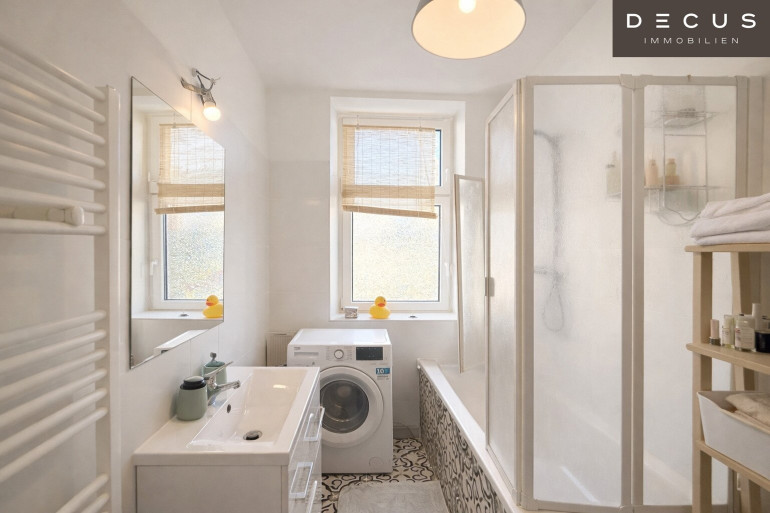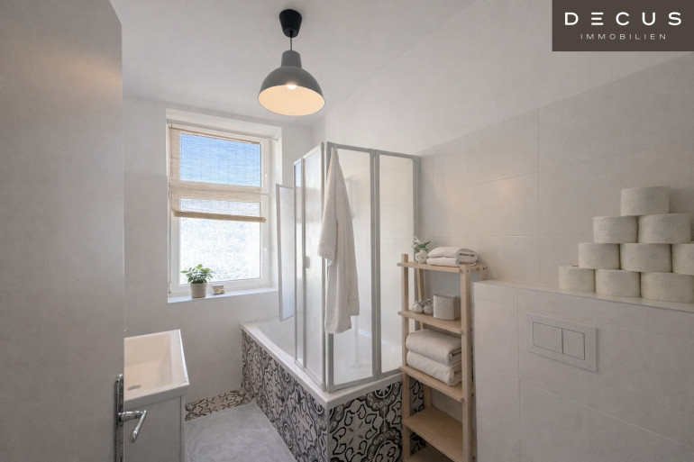 Auch das Badezimmer überzeugt mit Qualität und Komfort: Ein Fenster sorgt für angenehmes Tageslicht und natürliche Belüftung, die Badewanne lädt zum Entspannen ein. Der stilvoll sanierte Altbaucharakter des Hauses wurde mit zeitgemäßer Wohnqualität verbunden, und der im Haus vorhandene Lift bietet zusätzlichen Komfort im Alltag.