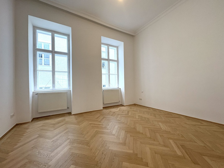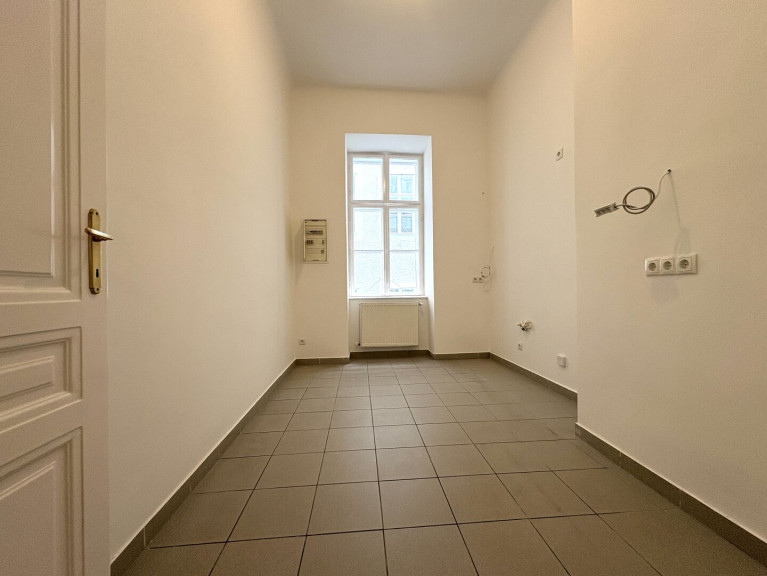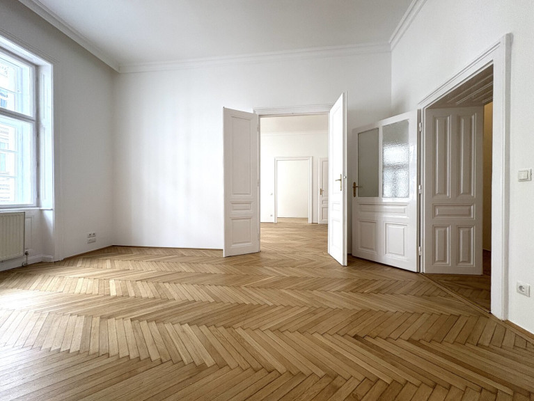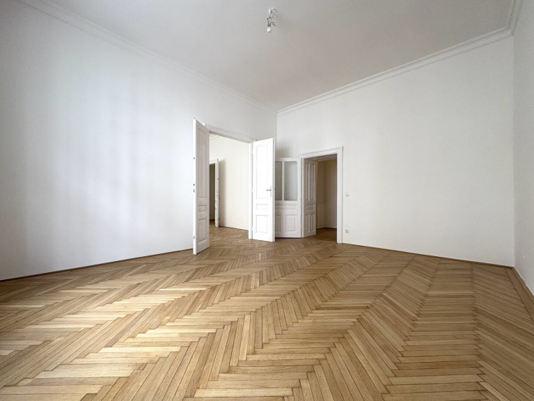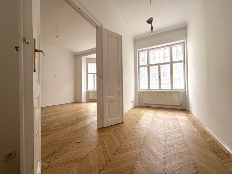 Die Wohnung liegt im Mezzanin, leicht erhöht und damit abgeschirmt vom direkten Straßenleben. Die Kombination aus Straßen- und Innenhofausrichtung sorgt für Helligkeit und Ruhe zugleich. Der klassische Grundriss bietet eine hervorragende Basis für individuelle Gestaltung – ob zeitlos elegant oder modern interpretiert.
