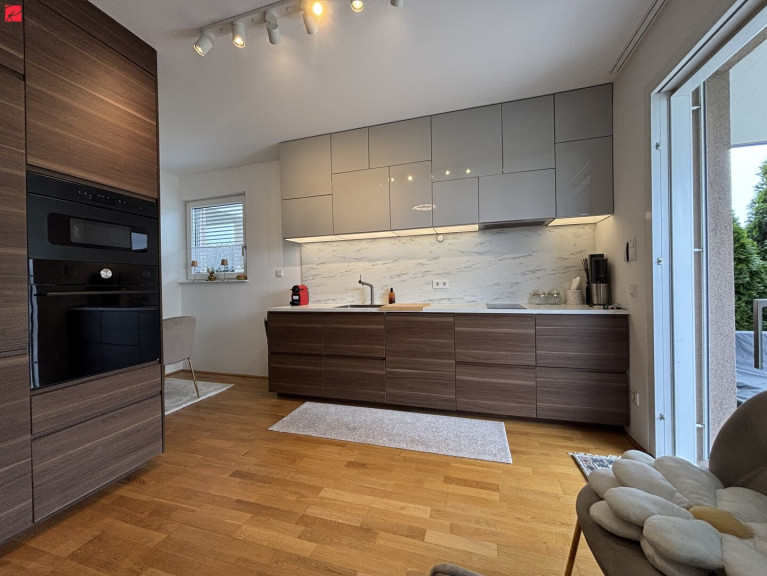 Die offene, stilvolle Küche ist mit hochwertigen Geräten, sowie reichlich Stauraummöglichkeiten ausgestattet. Im großzügigen Wohn- und Essbereich erwartet Sie eine Fensterfront, welche einen schönen Blick in den eigenen Garten bietet. Im Badezimmer finden Sie eine Dusche, einen Waschtisch aus hochwertigem Massivholz und einen Waschmaschinenanschluss. Im Vorraum befinden sich mehrere Kästen für Ihre Garderobe. Die gesamte Wohnung wurde mit einer Raumhöhe von 2,75 Metern erbaut, sodass Sie eine angenehme Raumatmosphäre genießen können.