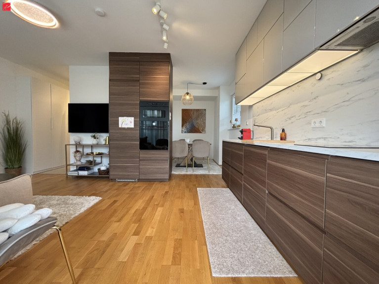 Fliesen, Parkett, Fußbodenheizung, Einbauküche, Wohnküche / offene Küche, Südbalkon, Dusche, Tiefgarage, Sauna