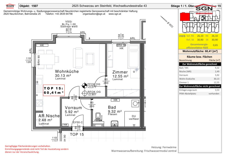 | Heizwärmebedarf: | B 30,90 kWh/m²a |