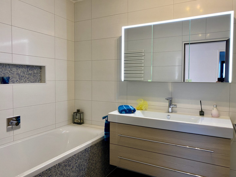 Fliesen, Kunststoffboden, Teppichboden, Öl, Zentralheizung, Einbauküche, Südbalkon, Badewanne, Dusche, Kabel/Satelliten-TV, Parkplatz