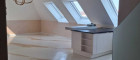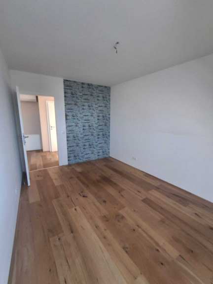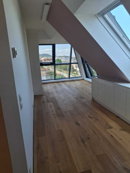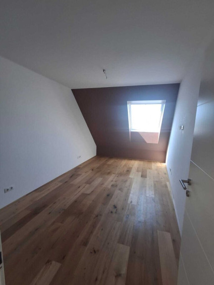 Über eine schöne Holztreppe geht es dann in den oberen Bereich der Wohnung. Hier befinden sich ein Schlafzimmer, eine Toilette und eine Art Galerie, die mit einer großartigen Fensterfläche den Blick auf den Kahlenberg und auf den Leopoldsberg freigibt. Auch hier kann man unter Umständen ein Schlafzimmer schaffen.